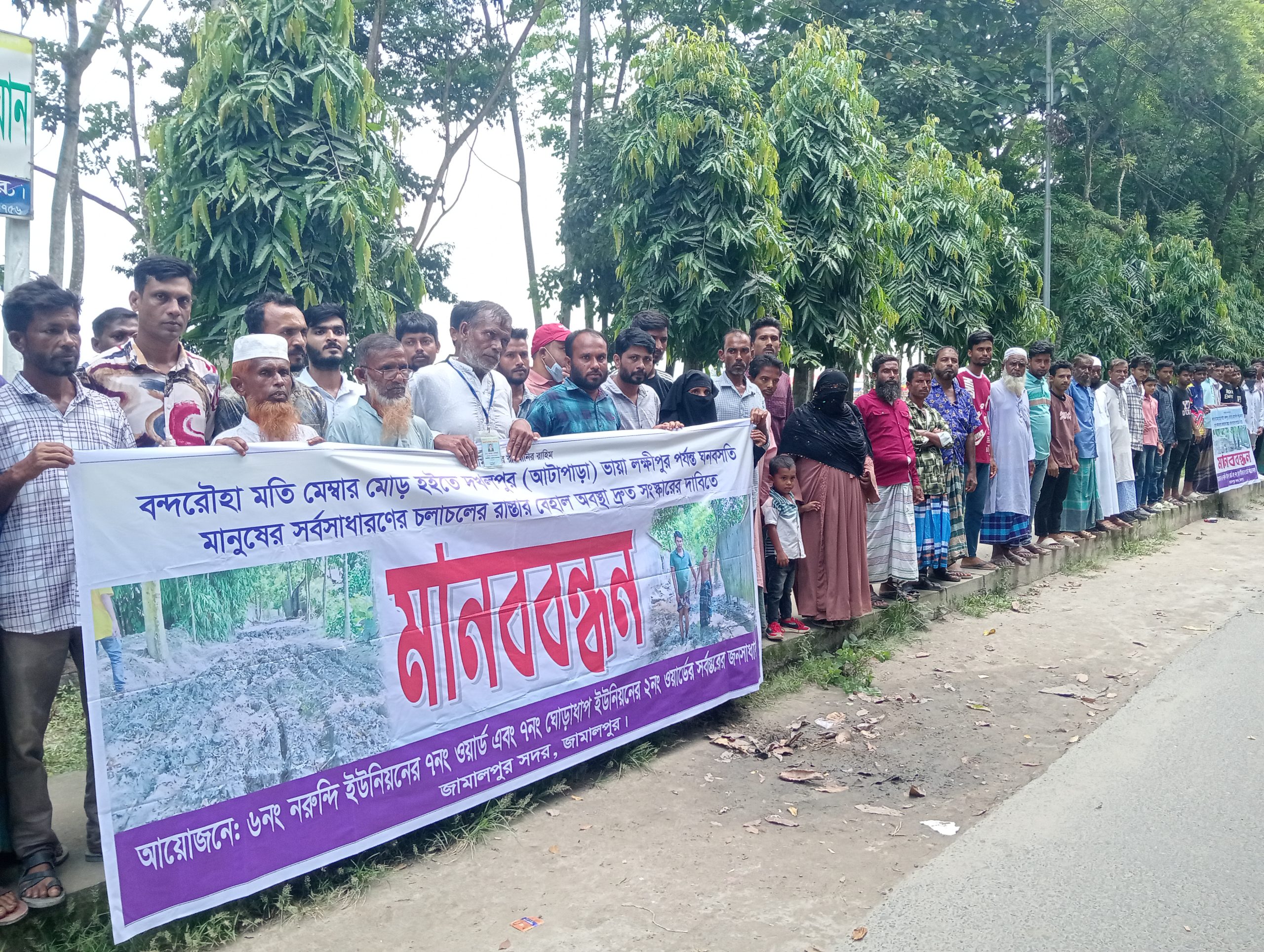 জামালপুর সদর উপজেলার নরুন্দি ও ঘোড়াধাপ ইউনিয়নের বন্দরৌহা মতি মেম্বার মোড় হইতে দখলপুর (আটাপাড়া) ভায়া লক্ষ্মীপুর পর্যন্ত ঘনবসতি মানুষের সর্বসাধারণের চলাচলের রাস্তার বেহাল অবস্থা দ্রুত সংস্কারের দাবিতে জামালপুরে মানববন্ধন করেছে নরুন্দি ও ঘোড়াধাপ ইউনিয়নের সর্বস্তরের জনগণ। সোমবার দুপুরে জেলা প্রশাসকের কার্যালয়ের সামনে এ ঘন্টাব্যাপী মানববন্ধন অনুষ্ঠিত হয়। মানববন্ধনে ঘোড়াধাপ ইউনিয়নের ২ নম্বর ওয়ার্ডের সাবেক গ্রাম সরকার আব্দুল জলিলের সভাপতিত্বে বক্তব্য রাখেন রেজাউল করিম, মোস্তাফিজুর রহমান, আটাপাড়া জামে মসজিদের পেশ ইমাম আবু সাঈদ, সাজেদা বেগম, মো. শাহ আলী, মো. শামীম মিয়া প্রমুখ। এ সময় বক্তারা বলেন, দেশ স্বাধীন হয়েছে ৫৪ বছর ধরে। এ এলাকার জনগণ ৫৪ বছর ধরে অবহেলিত। দুটি ইউনিয়নের প্রায় ২০ হাজার মানুষ এ রাস্তা দিয়ে চলাচল করে থাকে। এমনিতেই ২.৫ কিলোমিটার দৈর্ঘ্যের রাস্তাটি কাঁচা, একটু বৃষ্টি হলেই চলাচলের অনুপযোগী হয়ে পড়ে। আমরা এ অবস্থা থেকে মুক্তি চাই। আমাদের ছেলেমেয়েরা রাস্তার বেহাল অবস্থা কারণে ঠিকমতো স্কুল-কলেজে যেতে চায় না। এলাকায় যদি কোনো লোকজন অসুস্থ হয়ে পড়ে তাকে হাসপাতালে নেওয়া দুষ্কর হয়ে পড়ে। তারা আরও বলেন, এই বাস্তাটির আইডি নম্বর ৩৩৯৩৬৫৩০৪১। রাস্তার বেহাল দশার কারণে দ্রুত সময়ের মধ্যে একজন প্রসূতিকে হাসপাতালে নিতে না পেয়ে তার মৃত্যু হয়েছে। আমাদের এলাকার রাস্তাটির অবস্থা খারাপ দেখে এই এলাকায় কেউ বিয়ে করতে আসে না এবং আমাদের ছেলেমেয়েদেরকে বিয়ে দিতেও পারি না। রাস্তাটি দ্রুত পাকাকরণের জন্য জেলা প্রশাসকসহ সরকারের কাছে আকুল আবেদন জানিয়েছে এলাকাবাসী। মানববন্ধনে নরুন্দি ইউনিয়ন ও ঘোড়াধাপ ইউনিয়নের সর্বস্তরের জনসাধারণ উপস্থিত ছিলেন।