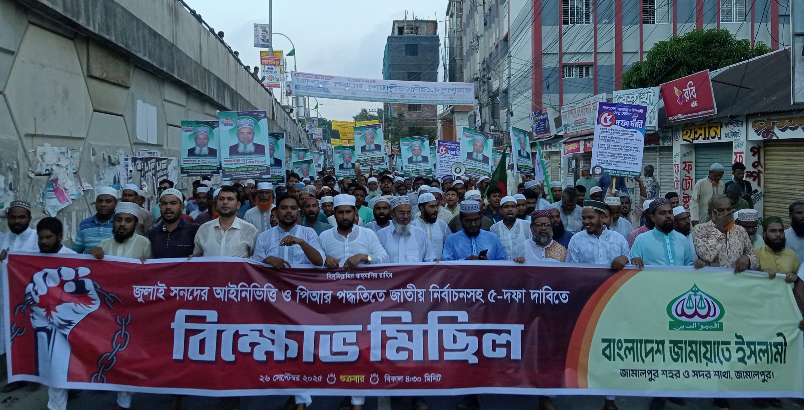 জুলাই সনদের আইনিভিত্তি ও পিআর পদ্ধতিতে জাতীয় সংসদ নির্বাচনসহ বাংলাদেশ জামায়াত ইসলাম কেন্দ্রীয় ঘোষিত পাঁচ দফা দাবি আদায়ের লক্ষ্যে জামালপুরে বিক্ষোভ মিছিল ও সমাবেশ করেছে জামায়াতে ইসলামী শহর ও সদর উপজেলা শাখা। শুক্রবার (২৬ সেপ্টেম্বর) বিকেলে শহরের পিটিআই মোড়ে এ সমাবেশ অনুষ্ঠিত হয়। জামায়াতে ইসলামী শহর শাখার আমীর আল ইমরান সুমনের সভাপতিত্বে সমাবেশে প্রধান অতিথির বক্তব্য রাখেন জামায়াতে ইসলামী জেলা শাখার আমীর ও জামালপুর-৫ সদর আসনের জামায়াত মনোনীত এমপি প্রার্থী মাওলানা মুহাম্মদ আব্দুস সাত্তার। প্রধান অতিথির বক্তব্যে জেলার আমীর মাওলানা আব্দুস সাত্তার জুলাই সনদের আইনিভিত্তি দিয়ে সে-আলোকে ফেব্রুয়ারিতে জাতীয় সংসদ নির্বাচনের ব্যবস্থার দাবি জানান। জামায়াতে ইসলামী জামালপুর শহর শাখার সেক্রেটারি নাজমুল হক মাসুদ ও সদর উপজেলার সেক্রেটারি রেজাউল করিম নোমানের সঞ্চালনায় সমাবেশে বিশেষ অতিথির বক্তব্য রাখেন জামায়াতে ইসলামী জেলা শাখার সেক্রেটারি আইনজীবী আব্দুল আওয়াল, অ্যাসিস্ট্যান্ট সেক্রেটারি অধ্যক্ষ সুলতান মাহমুদ, সদর উপজেলার আমীর মাওলানা শরিফুল ইসলাম, শহর শাখার সহকারী সেক্রেটারি মাওলানা ফরহাদ রেজা, শহর শাখার শ্রমিক কল্যাণ ফেডারেশনের সভাপতি আনোয়ারুল হক জামালী, ৪ নম্বর ওয়ার্ডের সেক্রেটারি খন্দকার ওয়াজিউল্লাহর, শ্রীপুর ইউনিয়ন শাখার আমীর হাফেজ মাওলানা মাহমুদ হোসাইন প্রমুখ। সমাবেশ শেষে এক বিক্ষোভ মিছিল বের হয়। শহরের প্রধান সড়ক প্রদক্ষিণ করে তমালতলা মোড়ে গিয়ে শেষ হয় মিছিলটি। সমাবেশ জামায়াতে ইসলামী জেলা, শহর ও সদর উপজেলার বিপুল সংখ্যক নেতাকর্মী উপস্থিত ছিলেন। এছাড়াও জামালপুরের দেওয়ানগঞ্জ, বকশীগঞ্জ, ইসলামপুর, মেলান্দহ, মাদারগঞ্জ সরিষাবাড়ি, সানান্দবাড়ি ও সদর উপজেলায় একযোগে বিক্ষোভ মিছিল ও সমাবেশ অনুষ্ঠিত হয়। ###